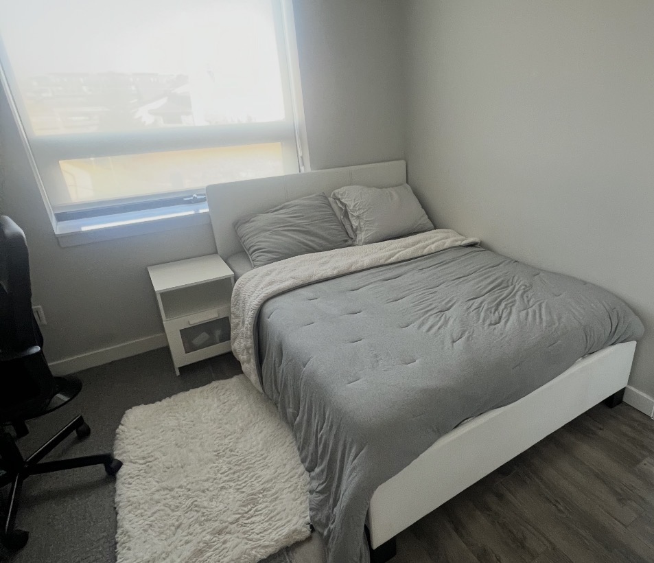 A very comfortable master bedroom, ideal for students staying over the summer, with only one roommate. The kitchen, laundry room, and bathroom are shared. The room is furnished with a queen-size bed, desk, chair, and wardrobe. -