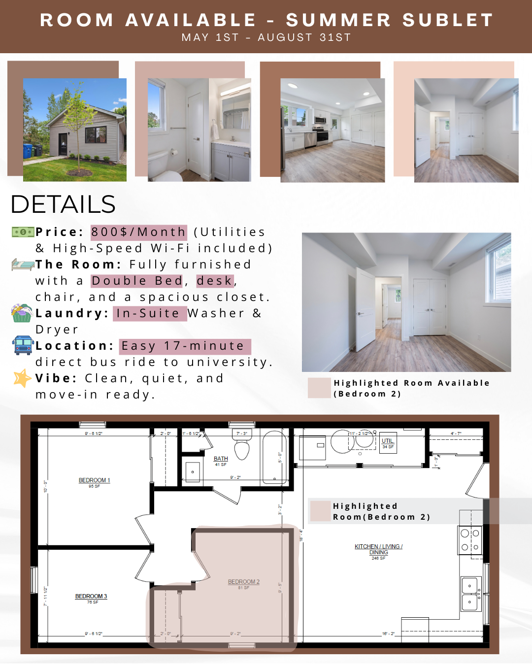Hi there! I’m offering a summer sublet starting May 1st! One very spacious room available. This house is a 15 minute walk and a 10 minute bus right to campus. The house is fully unfurnished so that is why the price is on the cheaper side but you do -