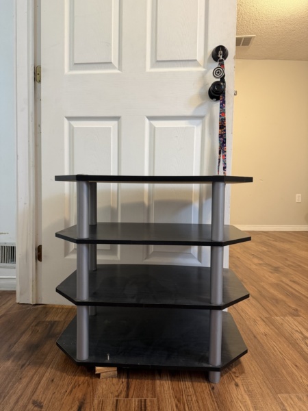 Modern black 4-tier TV stand with sturdy metal supports. Great for TVs, gaming consoles, speakers, or storage. Fits well in small spaces. Can also be used as a shoe rack!
