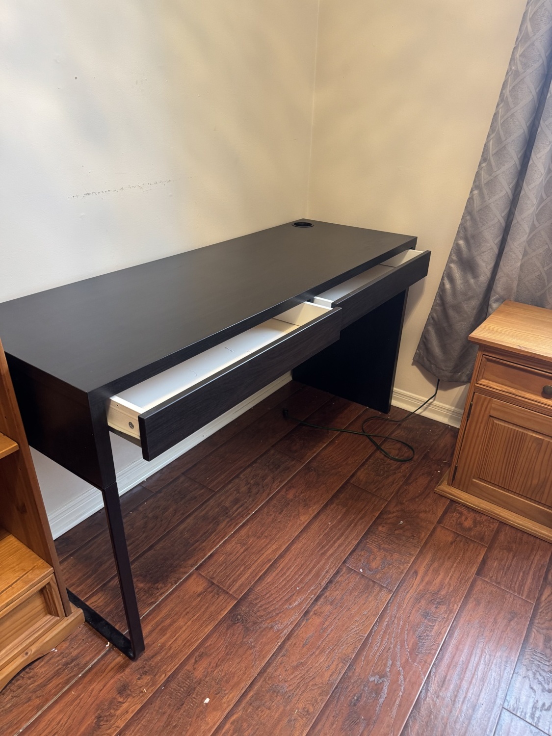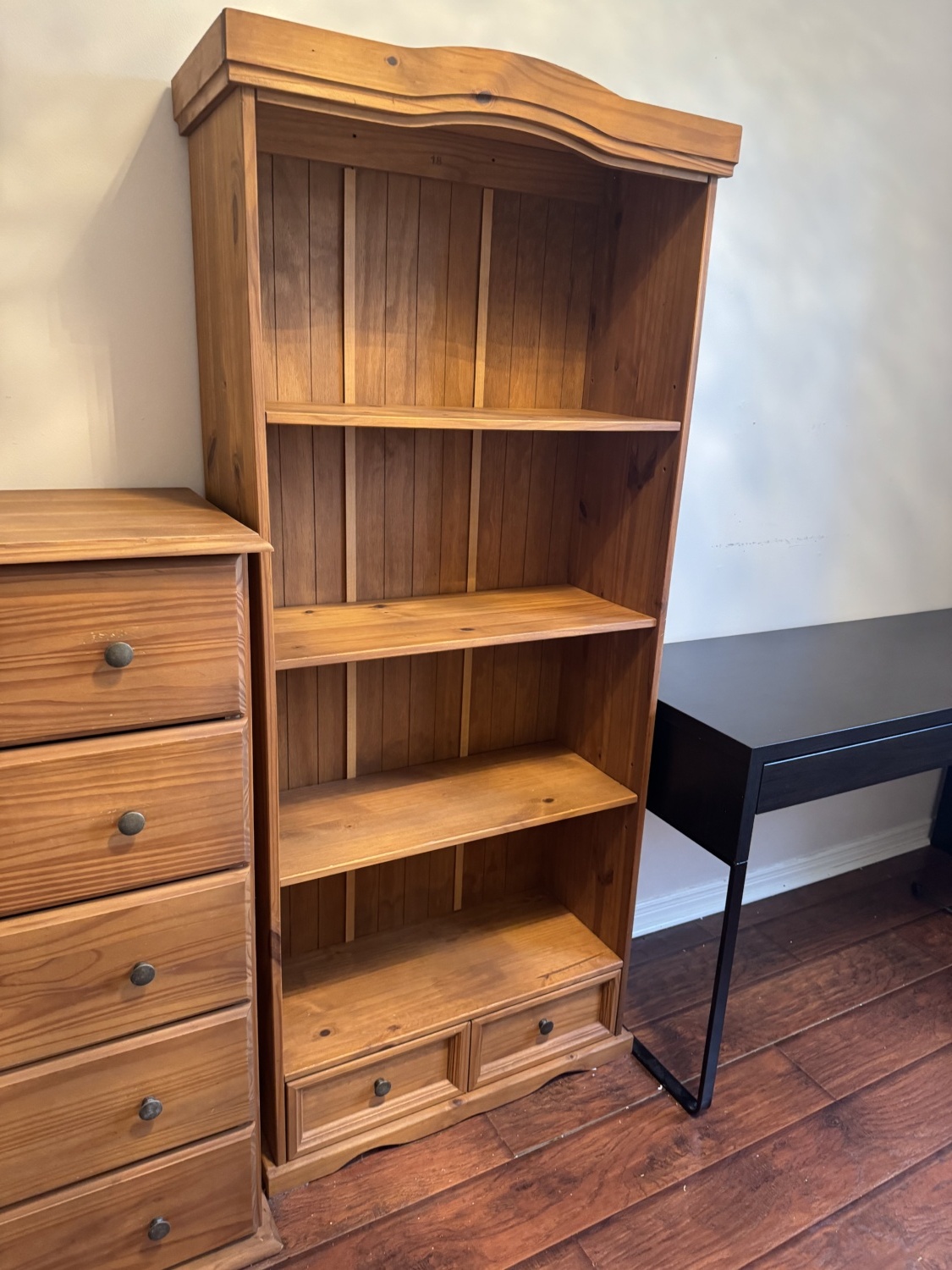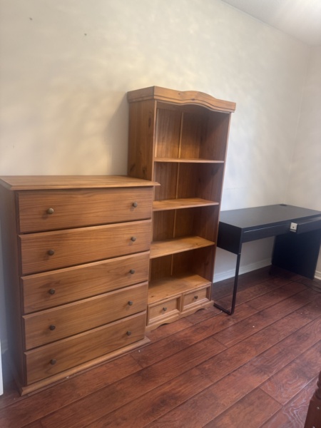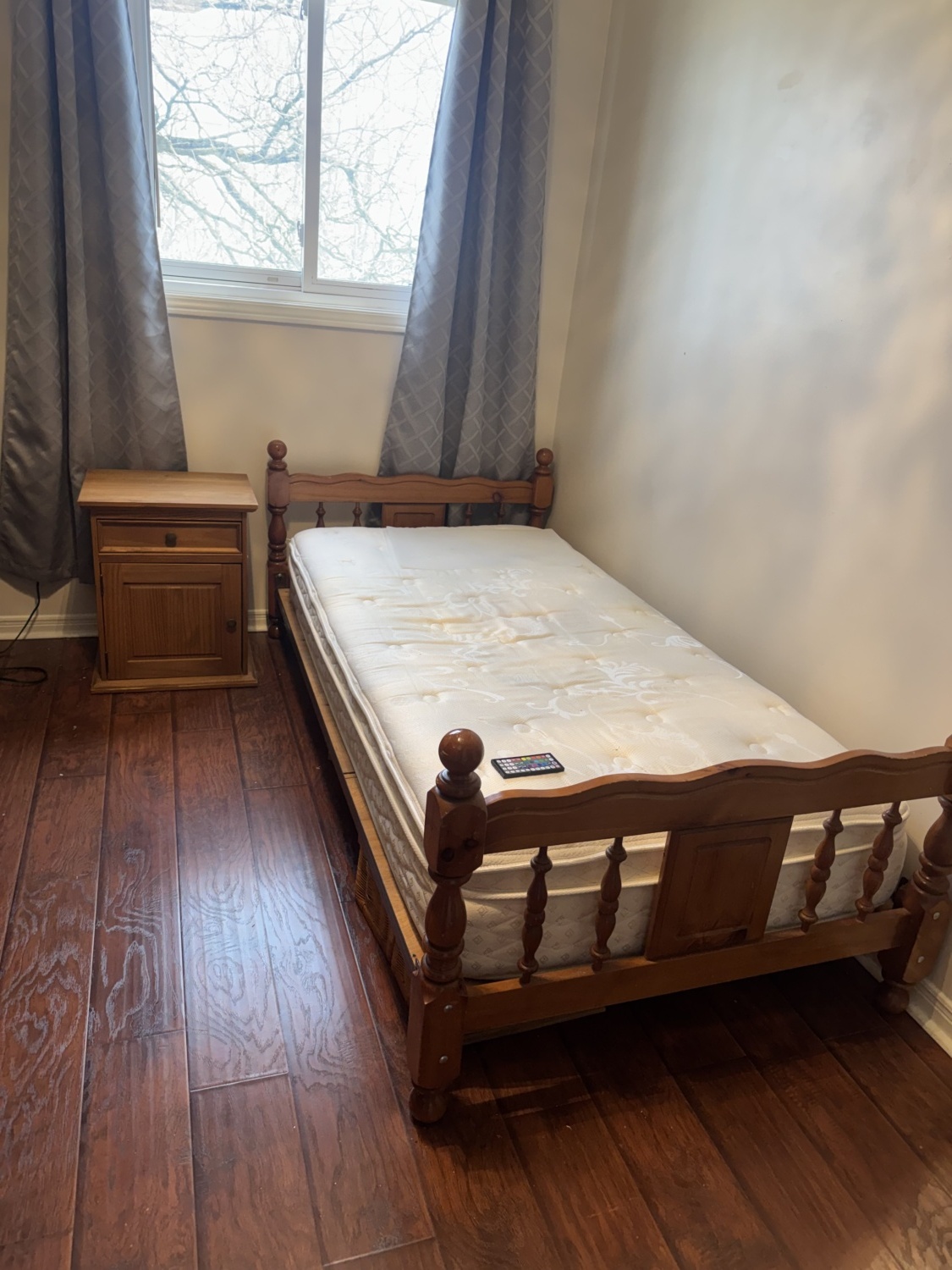 Dresser, bookcase, night table and single bed are made in Brazil of solid wood plus IKEA desk, twin bed with comfortable mattress. The mirror is not included.