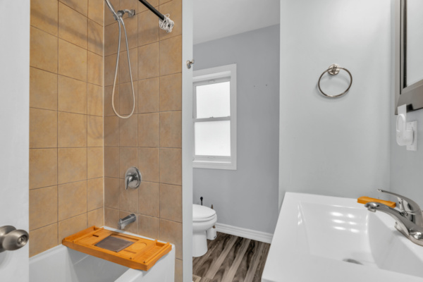 A clean and functional 4-piece bathroom with a tub and shower combination serves the home, offering both practicality and comfort.