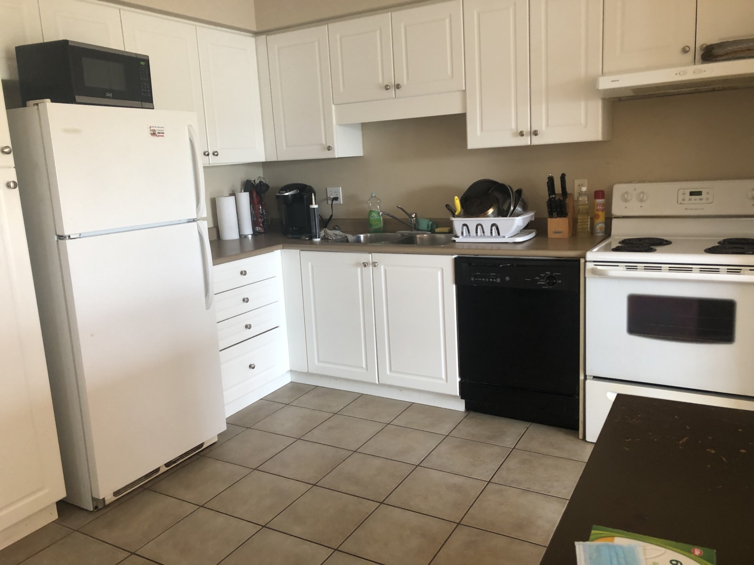Shared kitchen with dishwasher, large common area with sliding doors to deck overlooking conservation area.