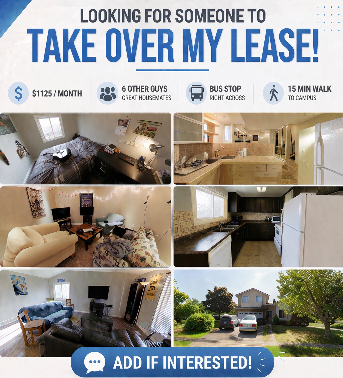 Spacious room available in a unique double unit turned into one large home. The house has two kitchens and two laundry setups, which makes sharing the space super convenient. There is parking available, plus a bus stop right outside for easy transportation. It is also only about a 20-minute max walk to campus. You’d be living with 6 other great guys in a social and easygoing house.