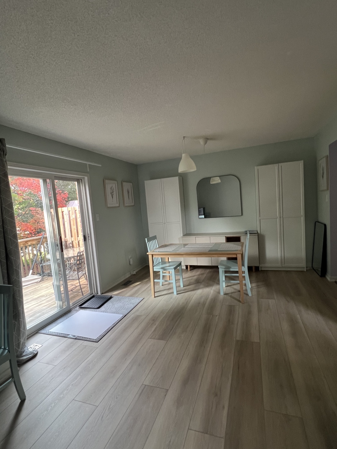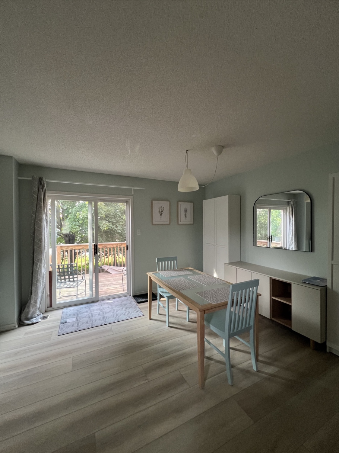 There is a spacious basement bedroom, with a private bathroom available in a fully furnished and newly renovated townhouse in a quiet complex. There are currently 3 female working professionals renting out the upstairs rooms. On the main floor there is a kitchen, living room, a powder room as well as a dining room that opens onto a furnished back patio. There is an in-suite laundry in the basement.