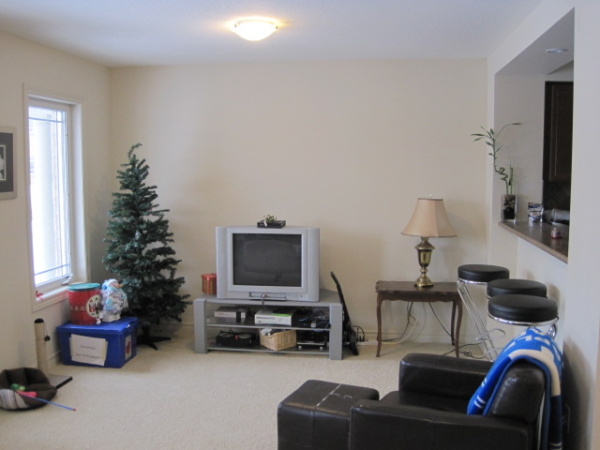 Cozy living room, with front door opening onto front porch.
