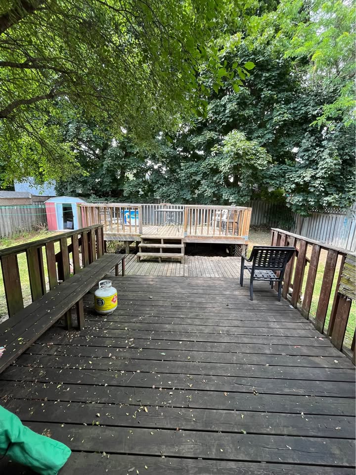 The house includes parking for 2 cars, a water softener to ensure smooth water, a dishwasher, washer/dryer, and 3 refrigerators on the main floor to accommodate all. It also comes with 1 couch for the common area and a flat-screen TV for entertainment. You’ll love the backyard deck for outdoor relaxation, plus a nearby park with wooded trails for hiking.