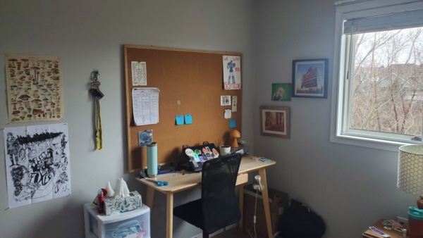 The room comes with a single bed, a bedside table and lamp, a good sized closet, a desk and desk chair, a corkboard, and 2 small movable shelves. The house itself is very nice, and comes with: very chill roommates; locks on every bedroom door; good wifi; an upstairs bathroom with a shower and a regular bathroom on the main floor; a garage and driveway; a kitchen with an oven, stove, dishwasher, microwave, fridge, toaster oven, air fryer, cabinet space and a pantry; a large living room with several seating options and a large TV, a washer and dryer upstairs, and a backyard and deck!