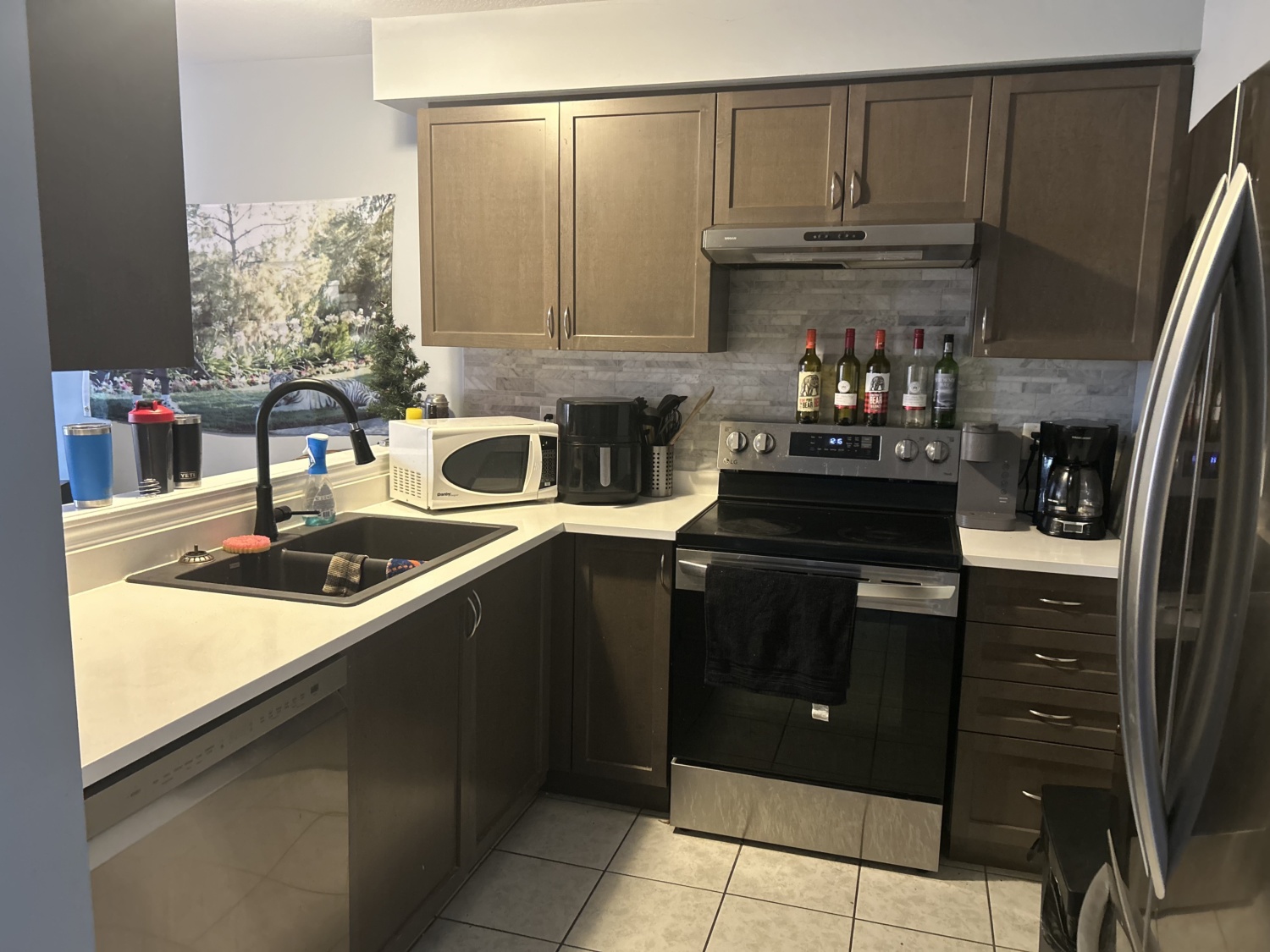 • Beautiful, high-end kitchen with quartz countertop, black granite sink, matte black faucet, stone backsplash and NEW stainless steel appliances