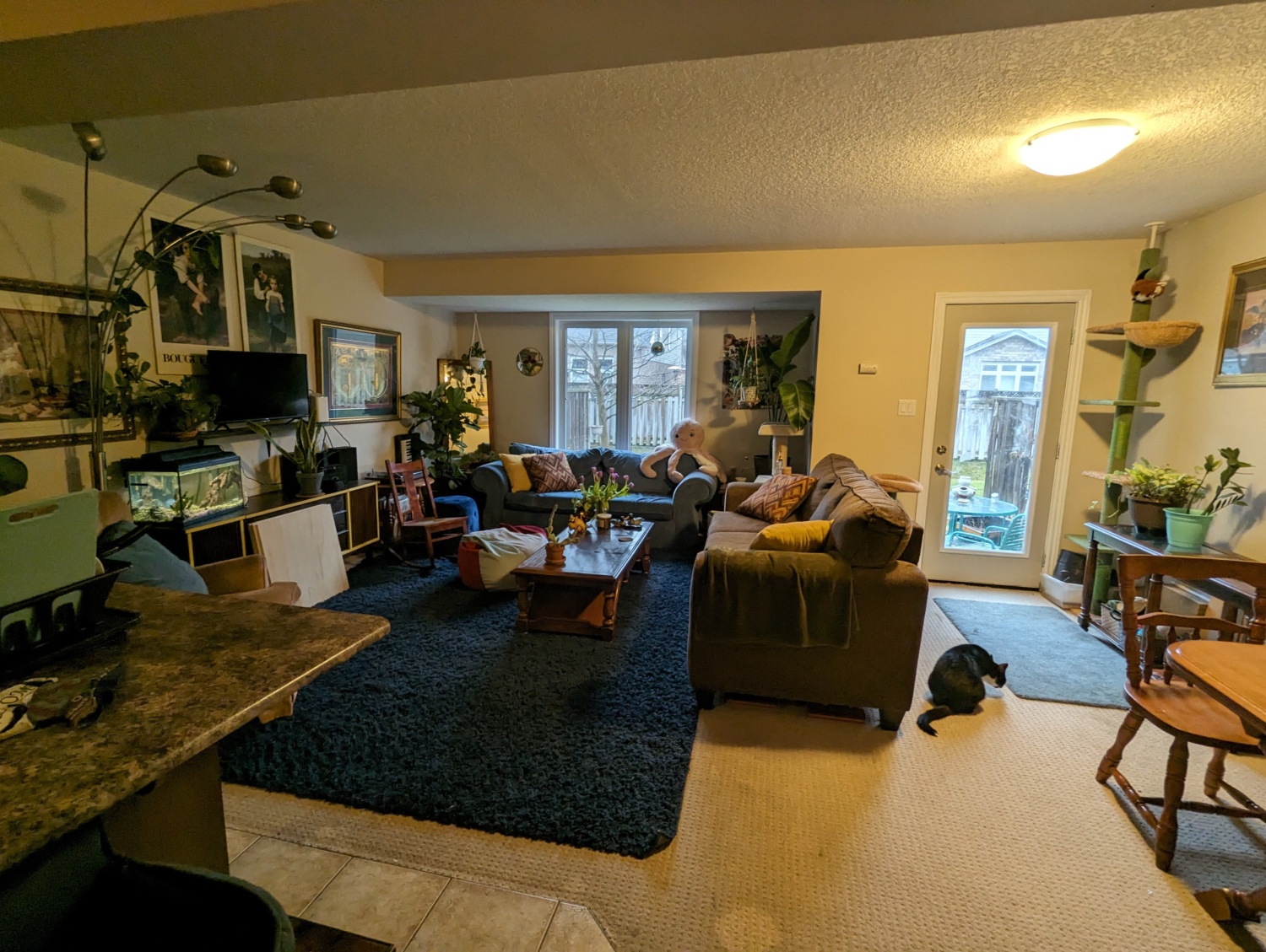 Carpeted living space & bedrooms.