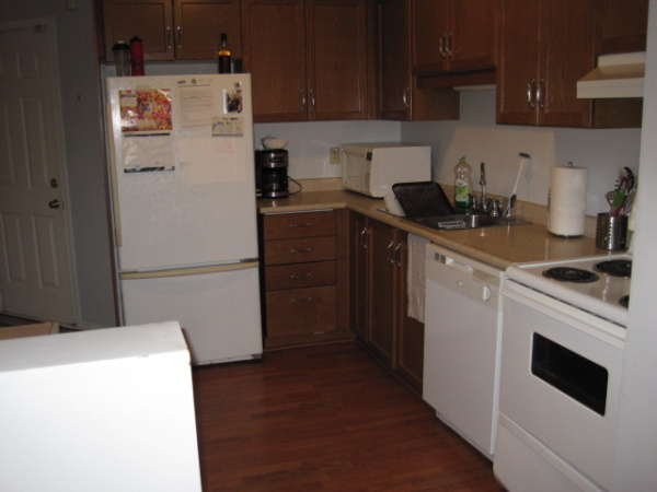 Full kitchen with white appliances (fridge, stove, & dishwasher).