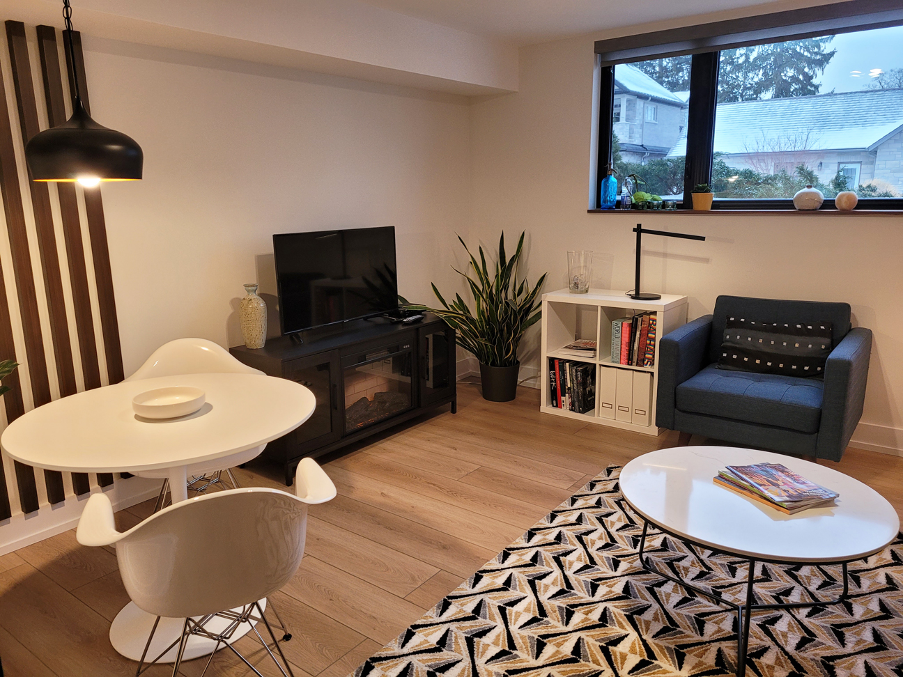 · Living room features large window, a large desk, 50” TV, and electric fireplace