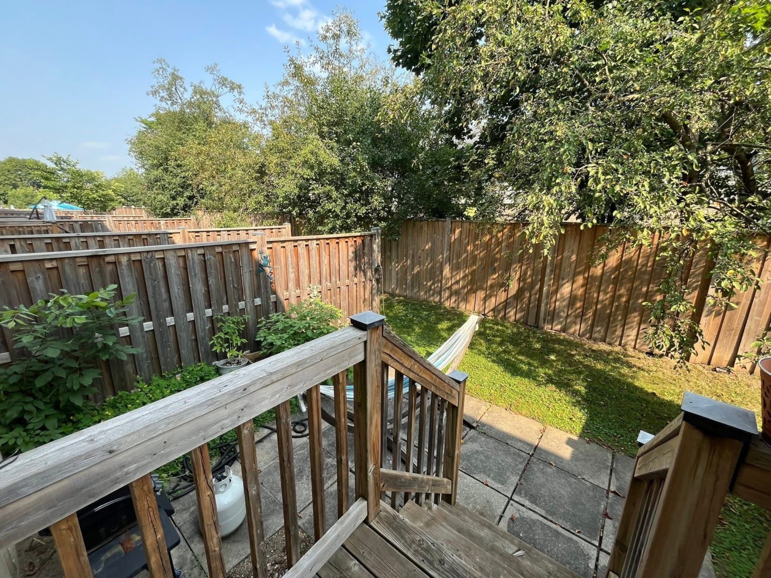 Private backyard surrounded by mature pine trees—quiet and secluded