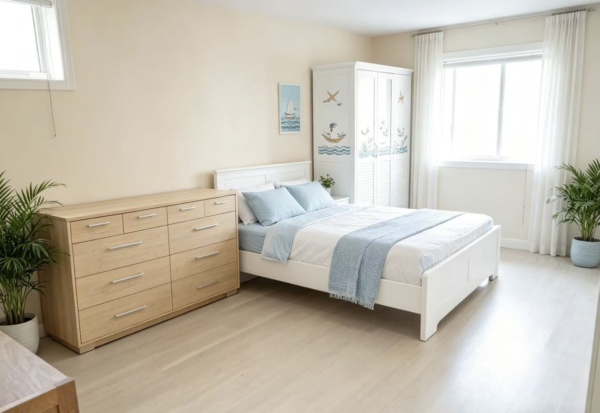A very comfortable master bedroom, ideal for students staying over the summer, with only one roommate. The kitchen, laundry room, and bathroom are shared. The room is furnished with a queen-size bed, desk, chair, and wardrobe.