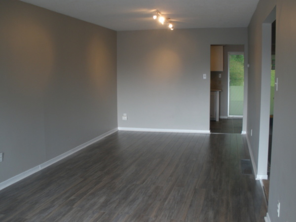 Main Floor: Open-concept living and dining area with modern finishes and updated kitchen cabinetry. Powder room on main floor.