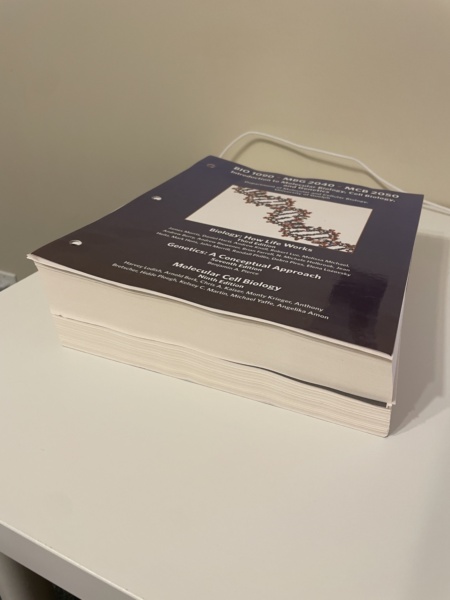 No binding, just papers for binder as sold in bookstore. The set is for 3 courses total, BIOL1090, MBG2040, and MCB2050.